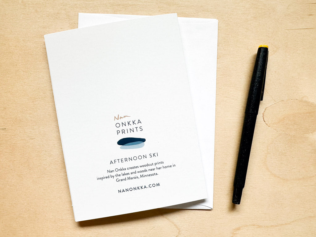 Looking for a uniquely beautiful greeting card that's both eco-friendly and locally crafted? You've come to the right place! These blank greeting cards come in the standard A6 size with white envelopes. Each card features one of Nan Onkka's timeless woodcut prints. The original woodcut was hand-carved by Nan in her home studio in Grand Marais, Minnesota. Her artistic skill and attention to detail shine through in every card, making them truly one-of-a-kind. Whether you are celebrating a milestone, mourning a loss, or simply saying hi, these blank cards are perfect to have on hand for any occasion.