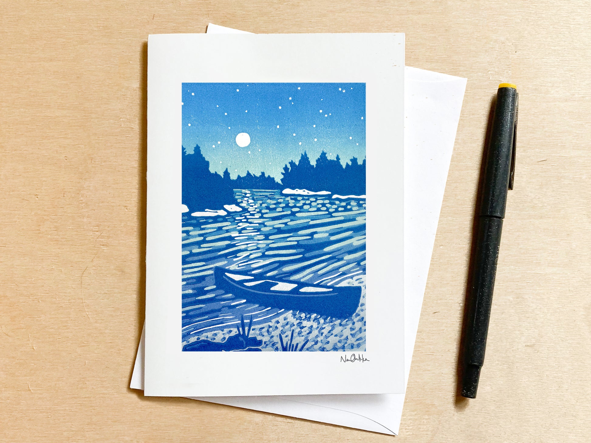 Looking for a uniquely beautiful greeting card that's both eco-friendly and locally crafted? You've come to the right place! These blank greeting cards come in the standard A6 size with white envelopes. Each card features one of Nan Onkka's timeless woodcut prints. The original woodcut was hand-carved by Nan in her home studio in Grand Marais, Minnesota. Her artistic skill and attention to detail shine through in every card, making them truly one-of-a-kind. Whether you are celebrating a milestone, mourning a loss, or simply saying hi, these blank cards are perfect to have on hand for any occasion.